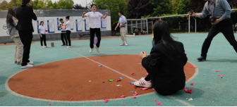 第二項進行的是“合力吹氣球”,共有六組參加,每組4人,每個人分工不同,吹、扎、運、破,完整的運送5個氣球并用屁股坐破所用的時間最短為獲勝。這個項目不僅考驗體力活、手工活,還考驗足夠強大的肺活量。