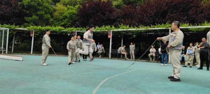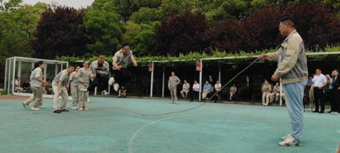 首先進行的是穿龍跳繩比賽。每支參賽隊伍由 10 名隊員組成,其中 2 人搖繩,8 人跳繩。隨著裁判的一聲哨響,搖繩的隊員迅速揮動手中的繩子,跳繩的隊員們則如敏捷的飛燕,一個接一個地穿過飛舞的跳繩。他們步伐整齊,節奏一致,口中喊著響亮的口號,為了團隊的榮譽而奮力拼搏。現場觀眾的加油聲、歡呼聲此起彼伏,整個賽場沉浸在一片歡樂的海洋中。這個項目不僅考驗了大家的協調性和敏捷性,還考驗了團隊成員之間的默契。有的隊伍配合得天衣無縫,動作流暢;有的隊伍則在歡聲笑語中出現了一些小插曲,但正是這些小插曲,為運動會增添了不少樂趣。