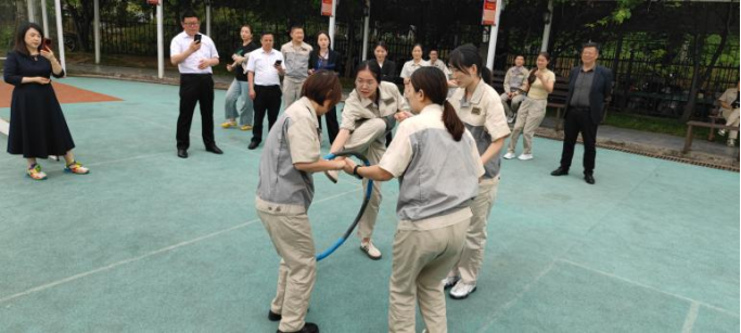 接下來的一圈到底比賽同樣精彩紛呈。4 人手拉手圍成圓圈站立,全程不得松手,呼啦圈掛在一人手臂上,裁判喊開始后,隊員需通過扭動身體、抬腿、低頭等方式,將呼啦圈從自己身上穿過并傳遞給下一人,完成三圈傳遞結束,用時最短的隊伍獲勝。比賽中,各隊隊員們緊密合作,充分發揮自己的靈活性和協調性,想盡辦法加快傳遞速度。有的隊伍利用身體靈活快速完成,有的隊伍不小心卡住了,但隊友們絲毫沒有抱怨,而是相互鼓勵,共同完成任務。則身體笨重采用了快速穿越的方式,有的隊伍則注重保持隊伍的穩定性,在穩中求勝。最終,鈑二代表隊憑借高效的傳遞技巧和緊密的團隊協作,贏得了一圈到底比賽的冠軍。