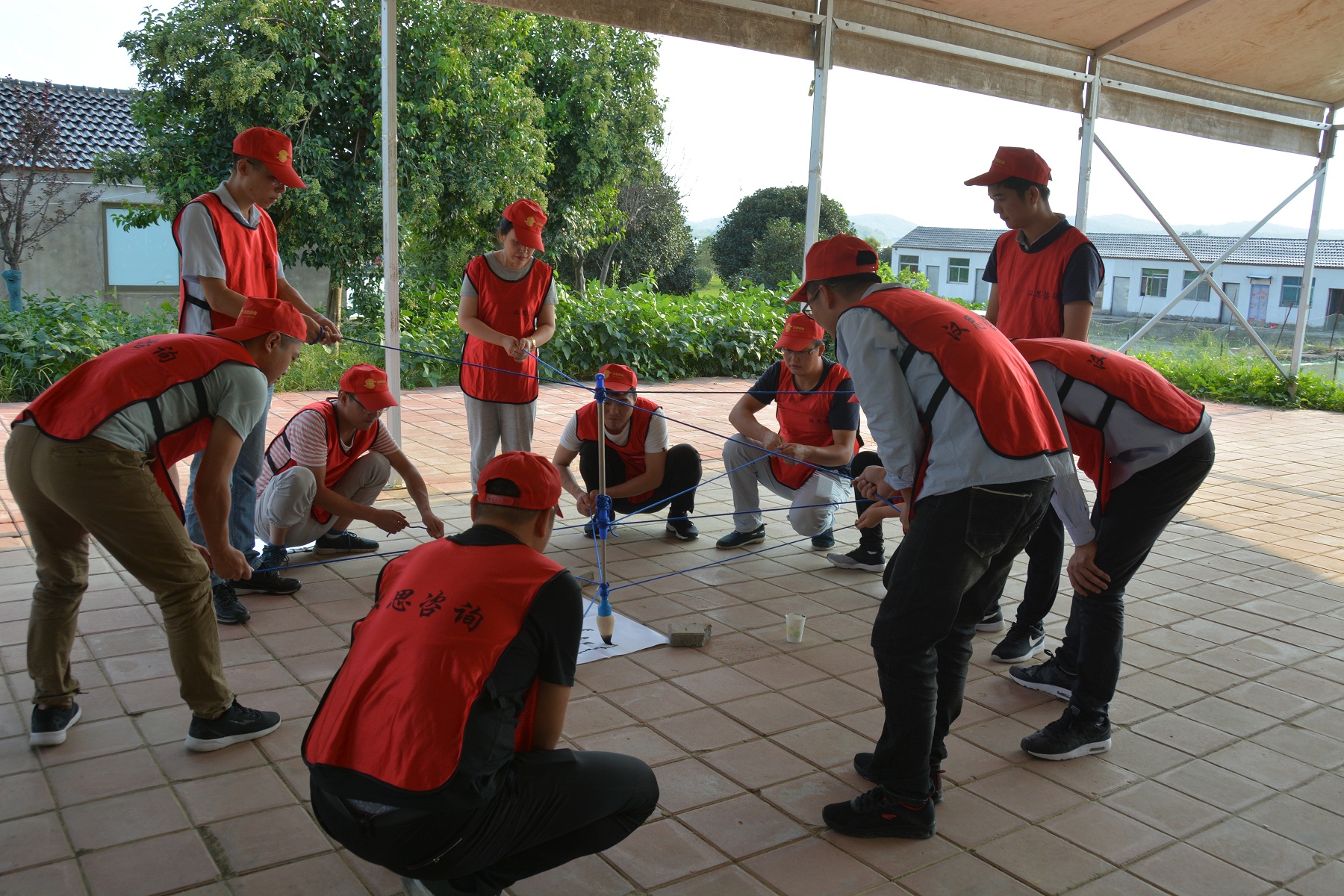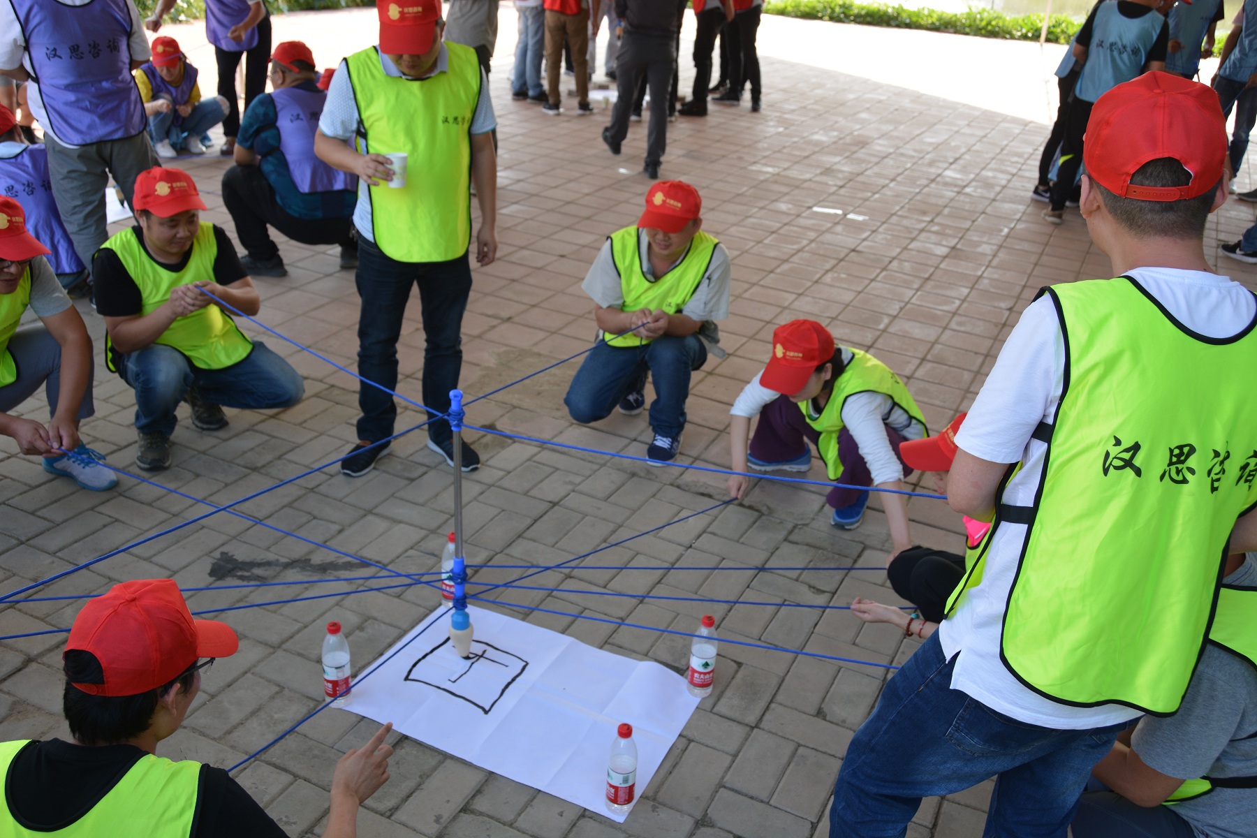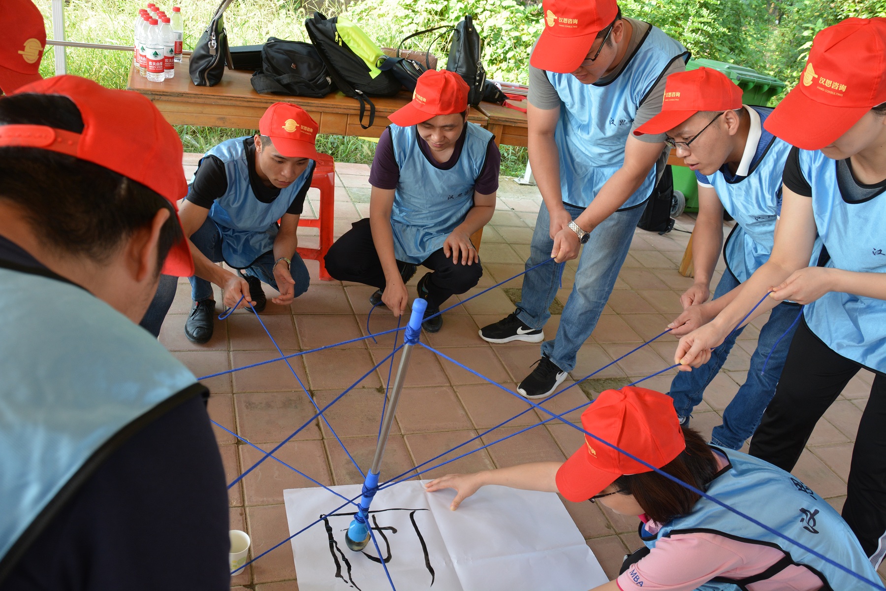 “一個(gè)巴掌拍不響,一根筷子易折斷”,妙筆生花活動(dòng)充分說明了團(tuán)隊(duì)成員之間協(xié)作的重要性。12名團(tuán)隊(duì)成員各拉著一根繩子的末端,彼此配合,彼此提醒,同心協(xié)力寫出了“團(tuán)隊(duì)”二字。