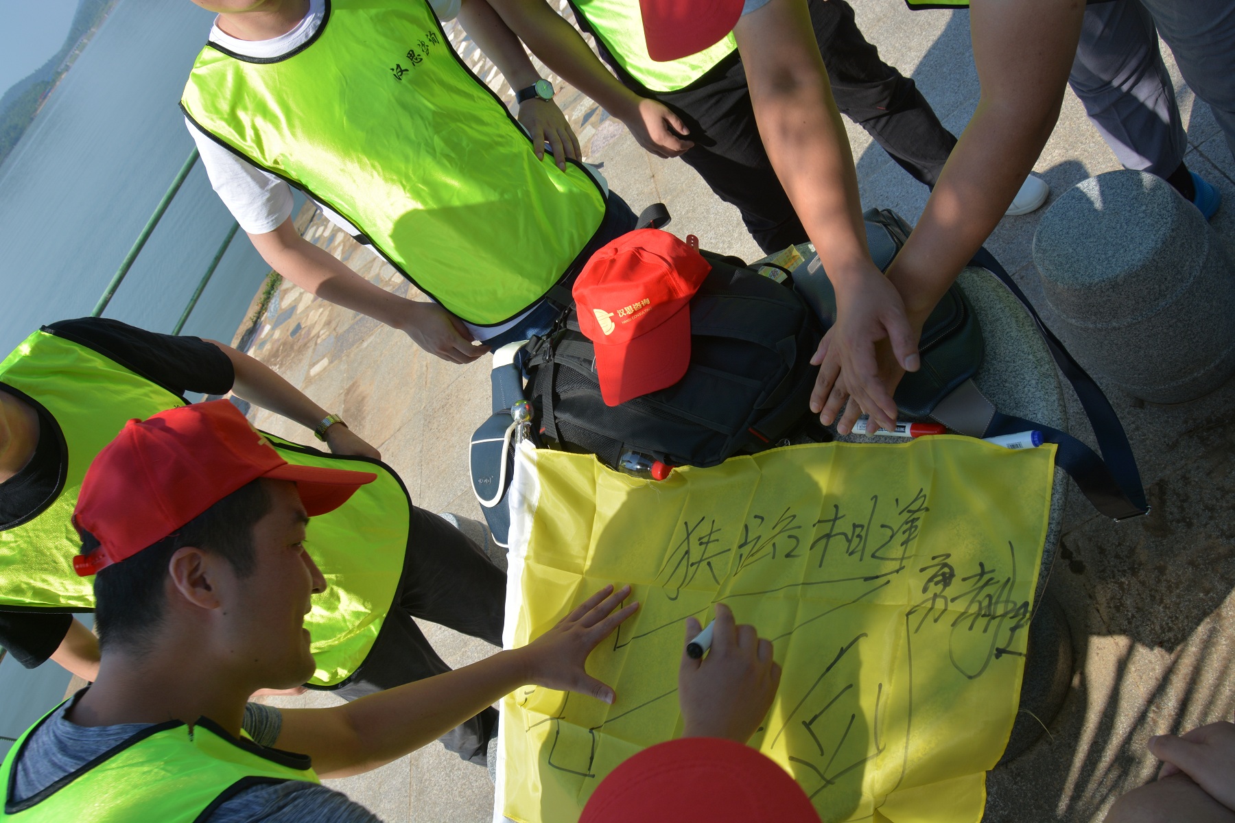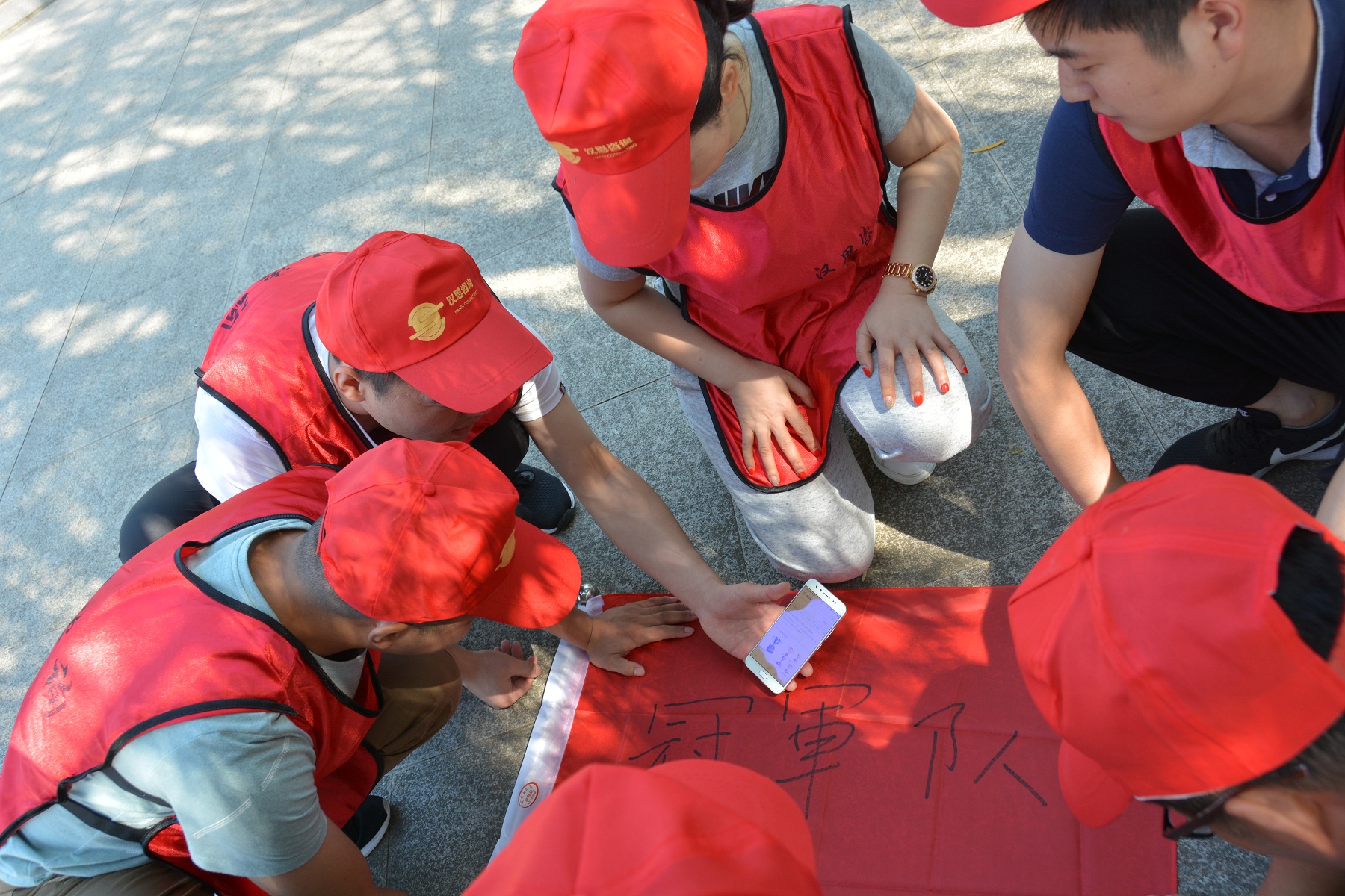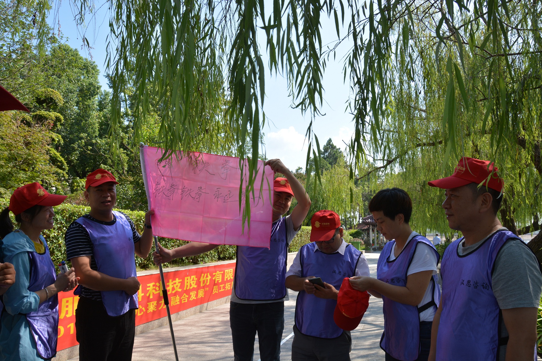 “一個(gè)巴掌拍不響,一根筷子易折斷”,妙筆生花活動(dòng)充分說明了團(tuán)隊(duì)成員之間協(xié)作的重要性。12名團(tuán)隊(duì)成員各拉著一根繩子的末端,彼此配合,彼此提醒,同心協(xié)力寫出了“團(tuán)隊(duì)”二字。