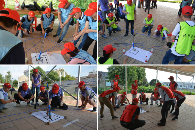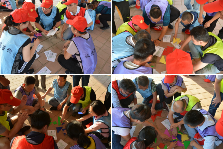 鑒于此次活動(dòng)的參與人員跨部門、跨專業(yè)、跨層級(jí),為保證所有人員的迅速融入,在隨機(jī)分成4組后,進(jìn)行了“解手環(huán)”等兩個(gè)簡單活動(dòng)的預(yù)熱,讓小組成員之間迅速的熟悉起來,為后續(xù)的團(tuán)隊(duì)組建及文化展示奠定了良好的基礎(chǔ)。4組隊(duì)伍在創(chuàng)建團(tuán)隊(duì)隊(duì)名、口號(hào)、隊(duì)標(biāo)及基本隊(duì)伍操練后,進(jìn)行了士氣昂揚(yáng)的團(tuán)隊(duì)展示。